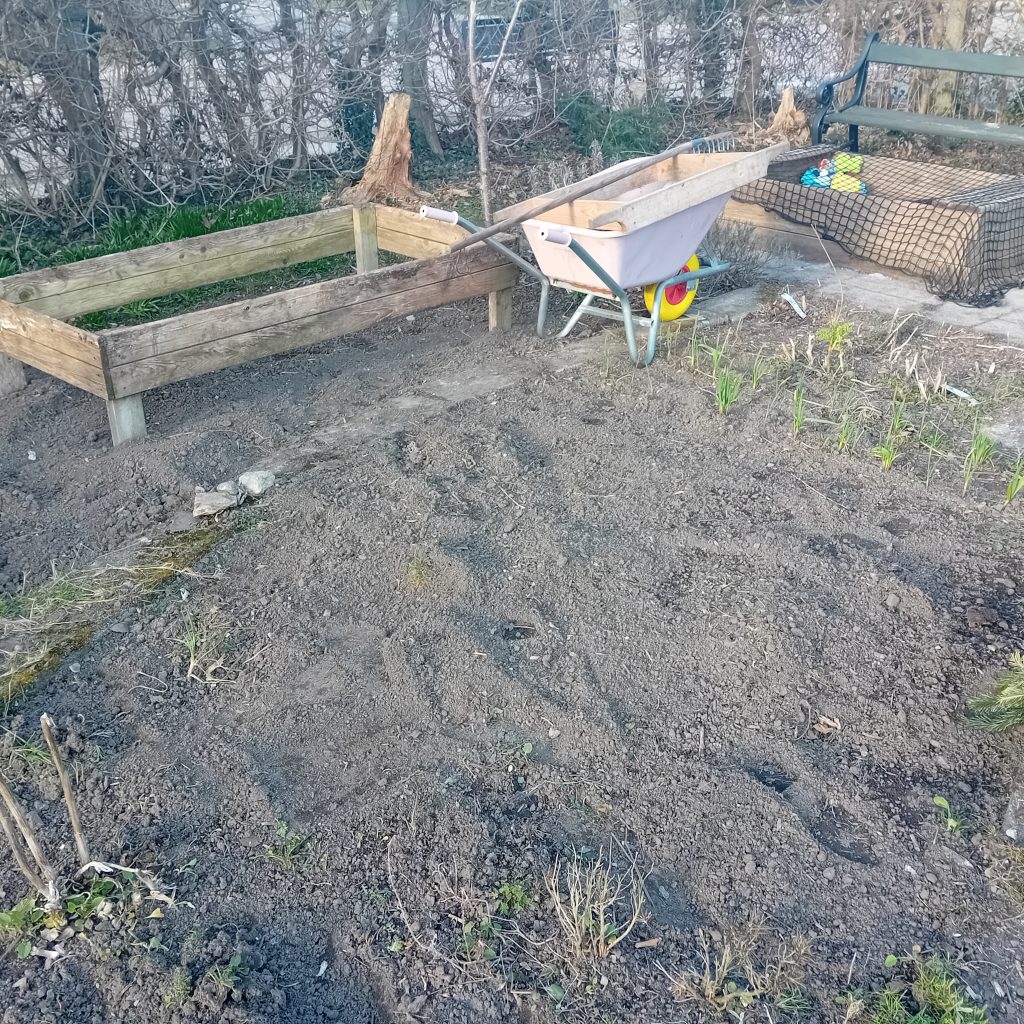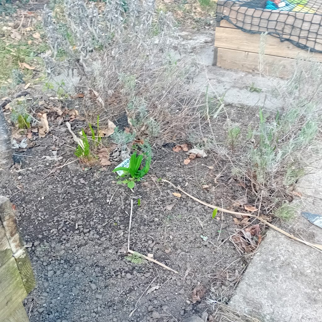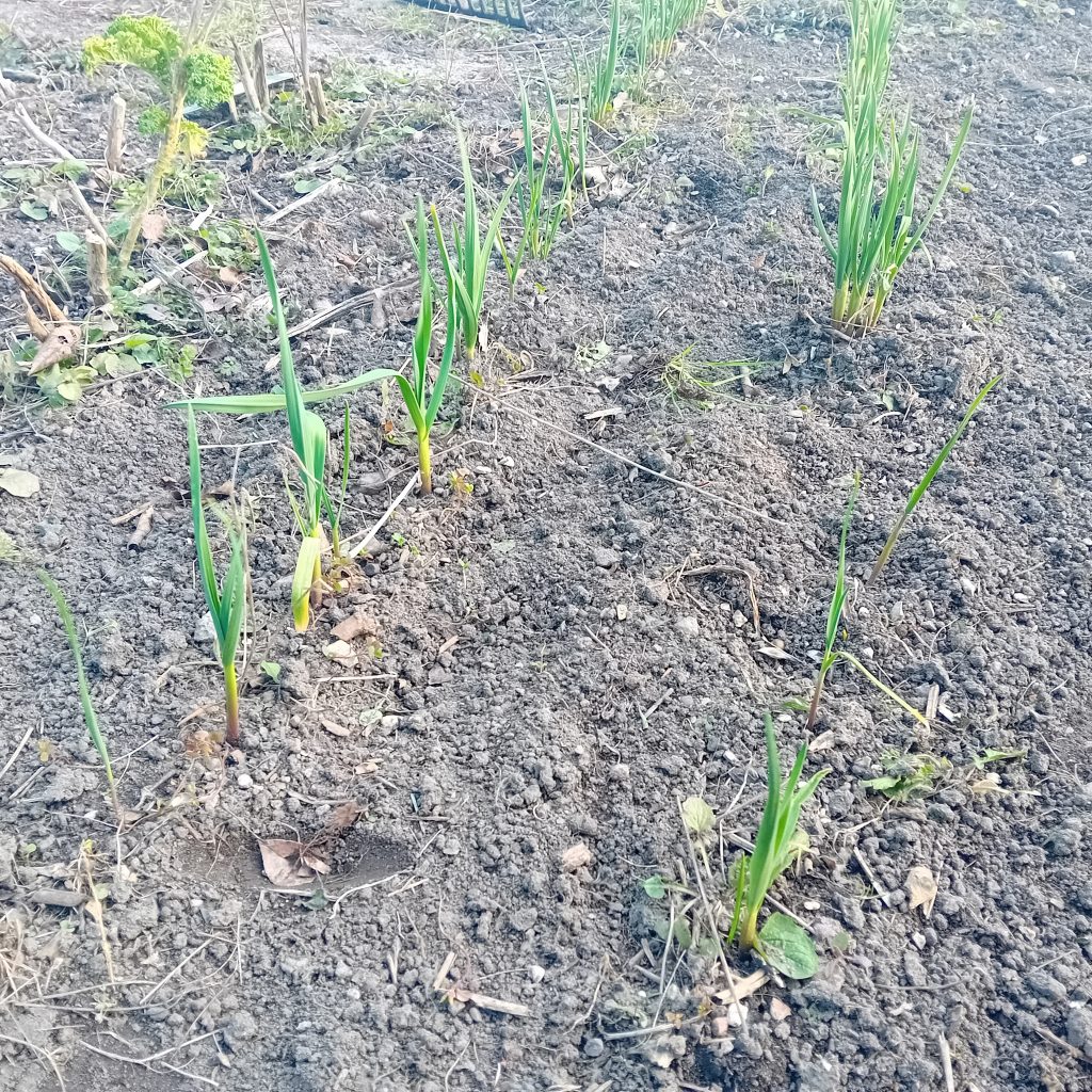 Der er også dukket nogle løg op. Jeg plantede nogle stikløg sidste forår – som jo så skulle have været høstet i 2025, men nu ser det ud som at de endelig er på vej – kun et års tid for sent.
