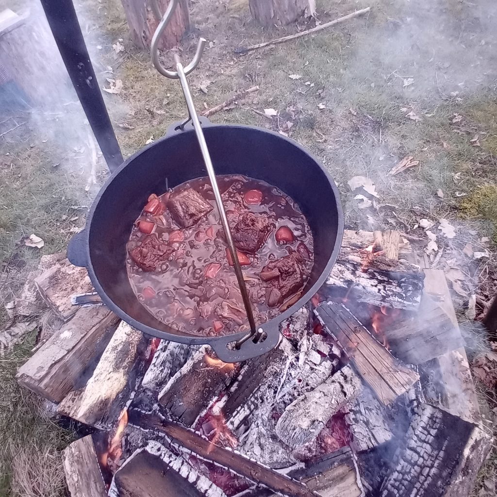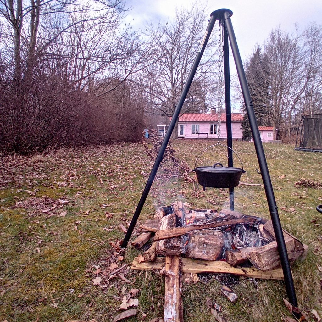 Der havde længe været et ønske om at prøve at lave et måltid over bål – ikke bare de sædvanlig snobrød. Så der er investeret i støbejernsgryde, grydestativ mv.