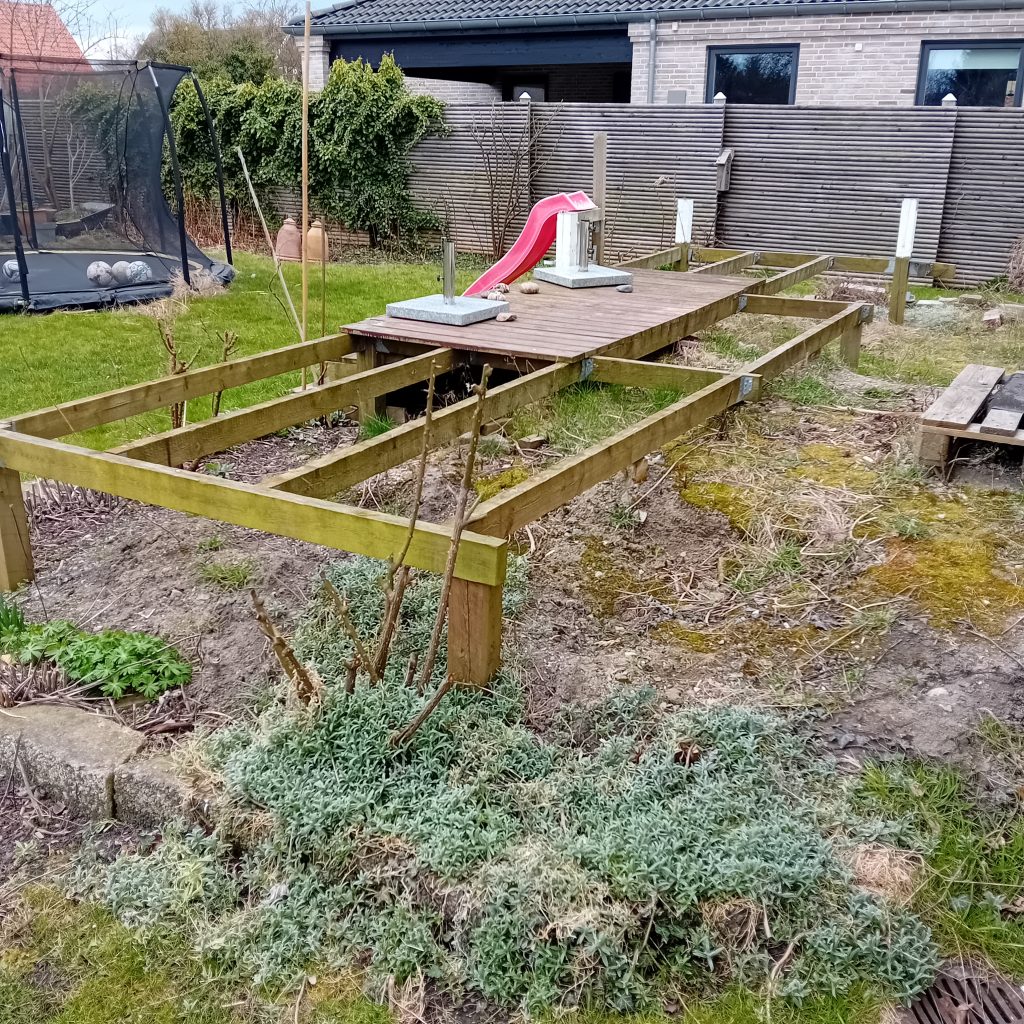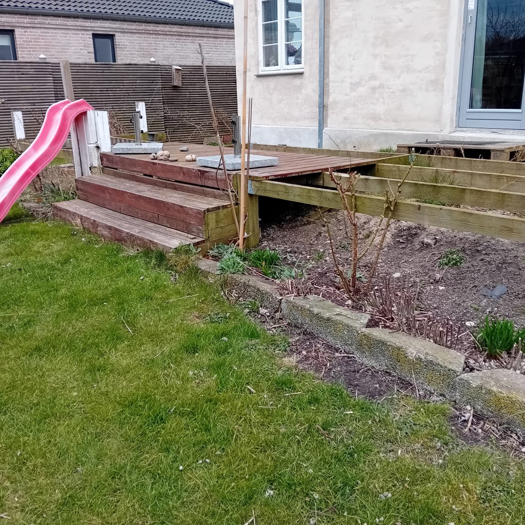 Det meste af terrassen var allerede fjernet i forbindelse med arbejder med huset, og opsætning af stillads rundt om huset for at skifte taget.
